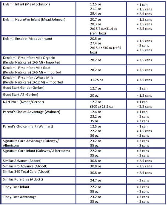 - Larger sized formula containers will remove more than one can from your balance – see the exchange rate in the chart.