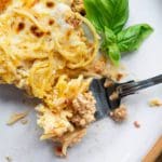Foods with dairy products are a good source of protein and fat for babies. This recipe tends to be soft so you can blend it fairly smooth (adding more sauce if needed). As your baby is more comfortable with texture you can blend less or smash with a fork. As your baby moves into finger foods you can cut the finished recipe into tiny finger sized bites to pick up. Talk to your pediatrician if you have concerns about food allergies.